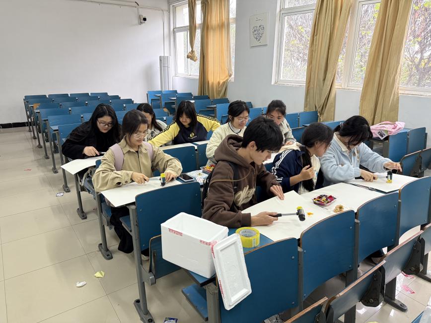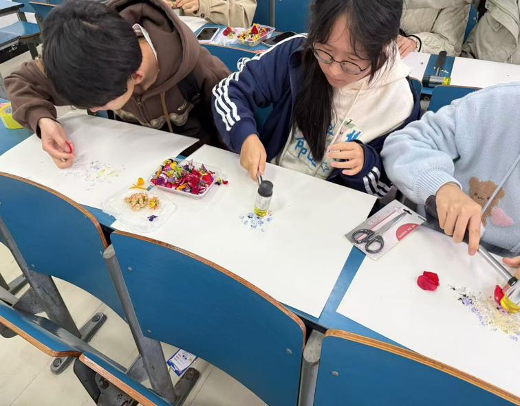 伴随着清脆的敲击声,同学们化身“自然魔法师”,用小锤细心敲打,将花瓣和叶片的原汁原膜与天然色素浸染至载体之上。一时间,菊花的千姿百态被永恒地定格——有的灿烂怒放,有的含苞待放,脉络清晰,意趣天成。每一件作品都是独一无二的艺术创作,凝聚着同学们对秋天的感知与对传统美的理解。