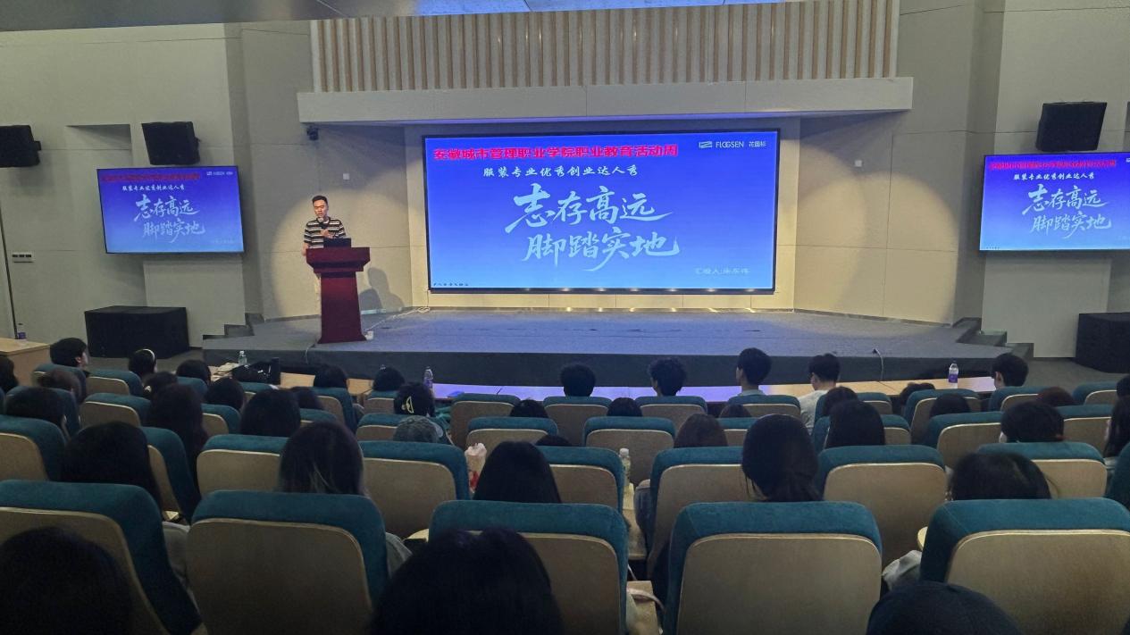 2025年5月16日下午,由安徽城市管理职业学院学前教育学院主办的职业教育活动周之服装专业优秀创业达人秀在艺馨楼报告厅成功举办。学前教育学院副院长王珊珊、服装教研室主任曹煜璐以及服装专业教师出席活动,活动特邀安徽花国衫(FLOGSEN)服装有限公司董事长朱东伟先生为23级服装设计与工艺专业的243名学生带来了一场精彩的创业经验分享。