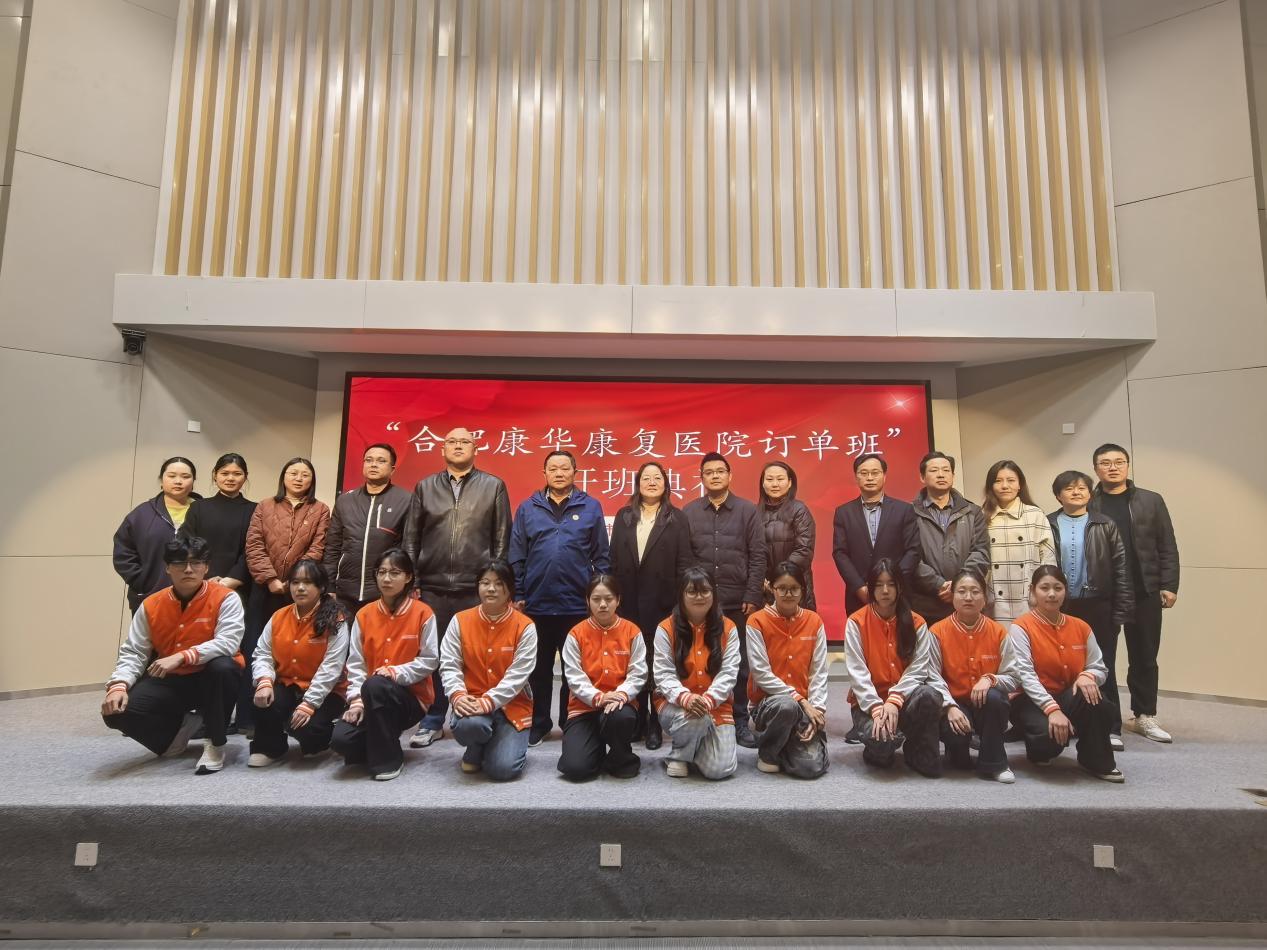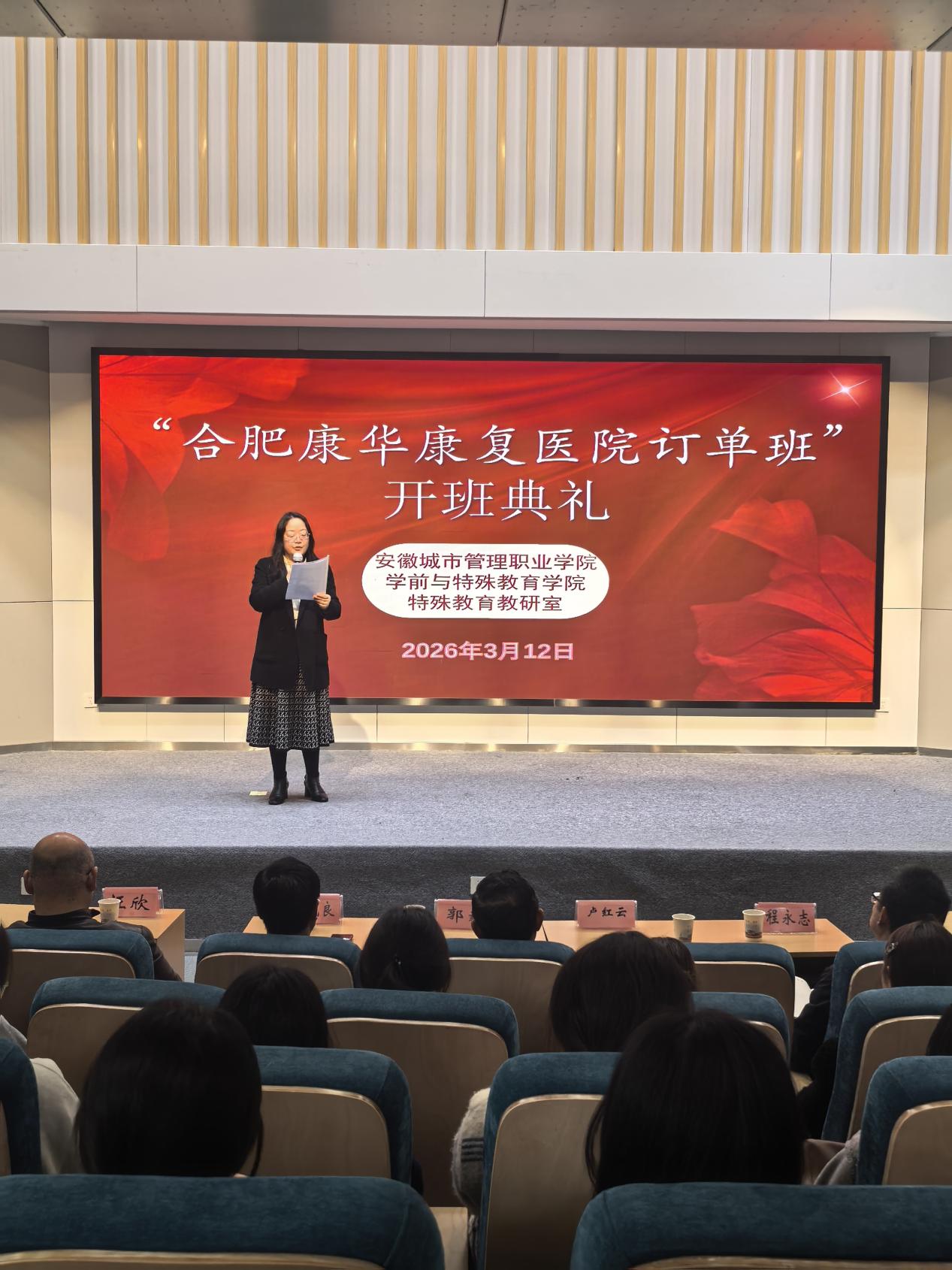 2026年3月12日下午,我院康华订单班第一期开班仪式在艺馨楼报告厅成功举行。学校产教融合办主任汪欣,我院副院长王珊珊,特殊教育教研室专业负责人史响及骨干教师孟雨昕、周莞尔、许凤麟,合肥康华康复医院(集团)卢红云副总、郭毅院长、李先良副院长、陈传敖主任、孙赫霆主任出席仪式,订单班10名入选学生及25级特殊教育专业学生共同参与,仪式由史响主持。