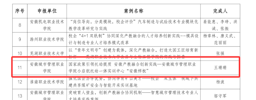 4月23日,安徽省职业与成人教育协会发布《关于“2025 年度安徽省职业教育改革创新典型案例”入选情况的公示》,我院副院长王珊珊主持申报的《国家政策引领托幼提质 安徽产教融合创新实践——安徽城市管理职业学院小启航托幼一体实训中心“安徽样板”》成功入选。